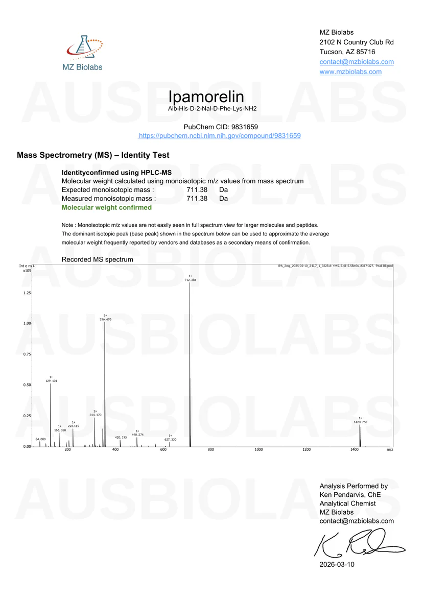 Ipamorelin is a synthetic pentapeptide that functions as a selective growth hormone secretagogue in laboratory studies. It is valued in research for its high selectivity and minimal interaction with other hormonal pathways, making it a preferred tool in growth hormone-related investigations.