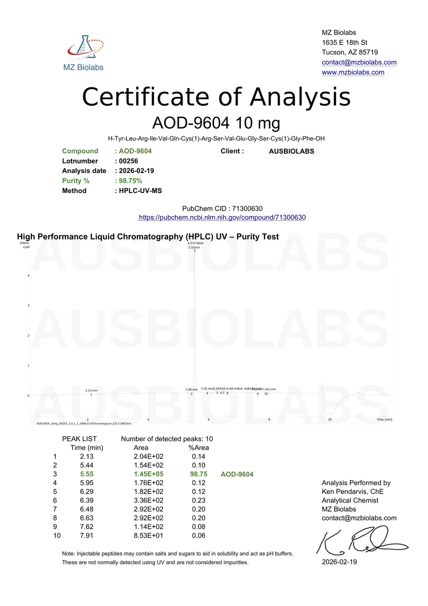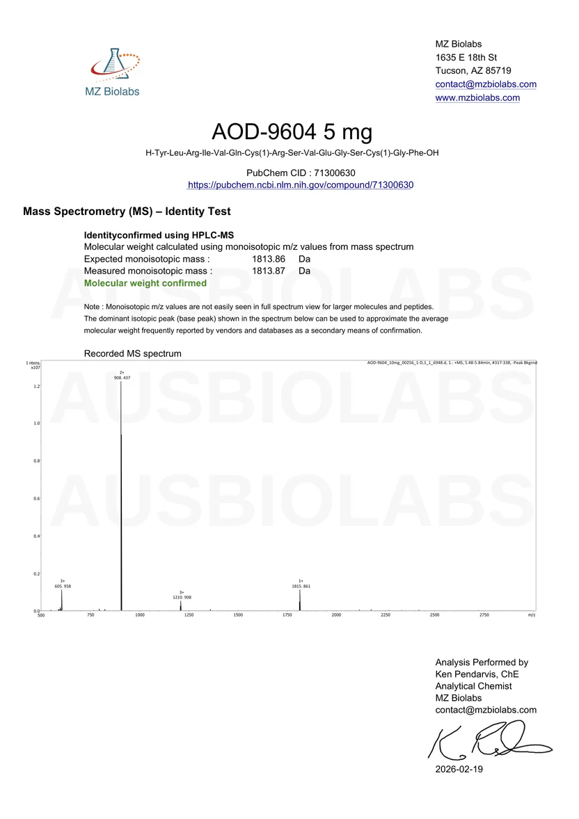 AOD 9604 is a synthetic peptide fragment of human growth hormone (HGH), specifically the C-terminal 15 amino acids (176–191) of the HGH molecule. In laboratory settings, AOD 9604 is studied for its potential role in lipid metabolism, including fat breakdown and inhibition of new fat formation. Unlike full-length HGH, AOD 9604 does not appear to affect blood sugar levels in research models.