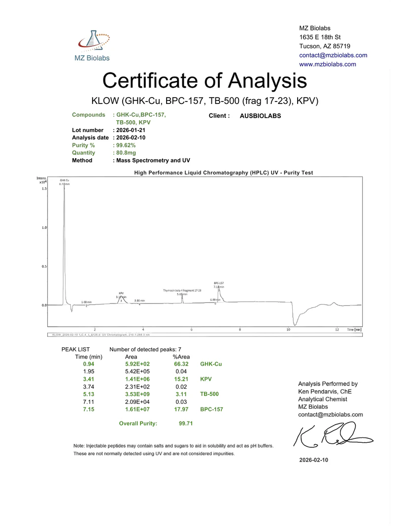KLOW is a synthetic investigational peptide blend supplied for laboratory research use.