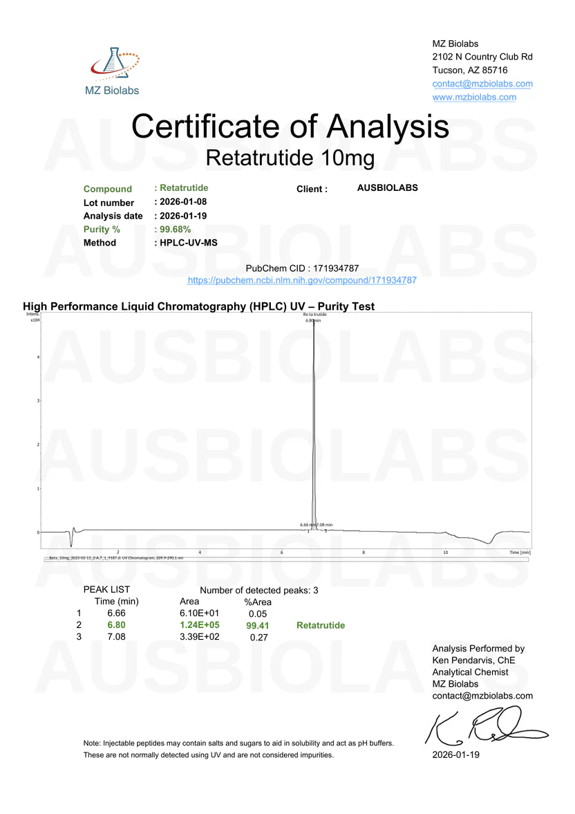Retatrutide is soluble in sterile water for injection (bacteriostatic water) under controlled research conditions. Stability may vary depending on pH, temperature, and exposure to light.