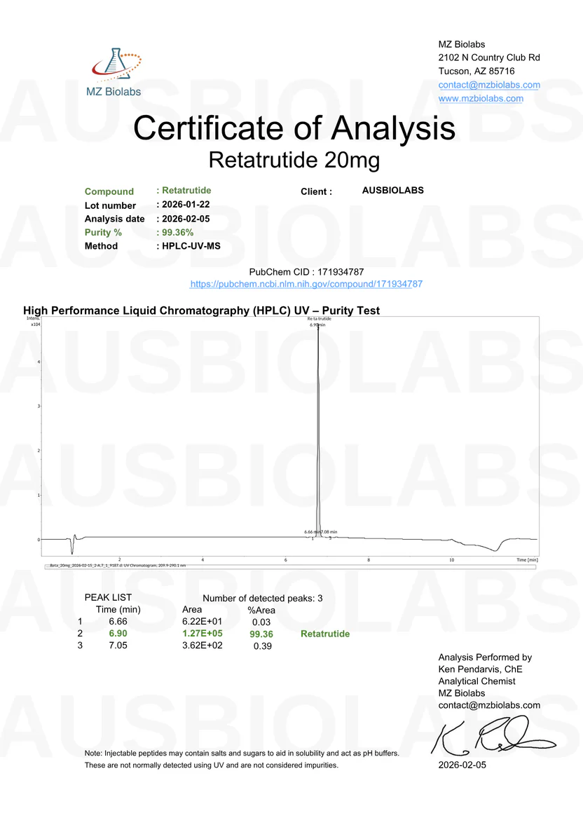 Retatrutide is a synthetic investigational peptide studied for its multi-agonist activity at GIP, GLP-1, and glucagon receptors. Its unique receptor profile makes it a valuable tool in pre-clinical research exploring metabolic regulation, energy expenditure, and glucose control in experimental models.